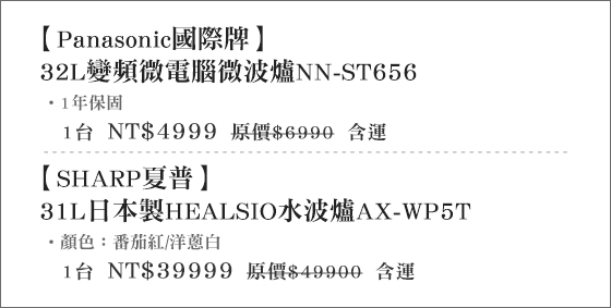 商品訊息簡述: 只要4999元起(含運)即可購得原價最高49900元微波爐系列任選1台:(A)【Panasonic國際牌】32L變頻微電腦微波爐(NN-ST656)/(B)【SHARP夏普】31L日本製HEALSIO水波爐(AX-WP5T)。