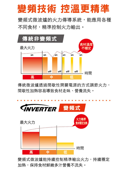 ●變頻微電腦微波爐採變頻技術,精準掌控火力輸出