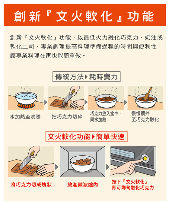 ●文火融化巧克力、奶油、吐司等食材,料理事前準備更省時