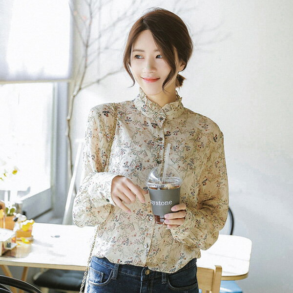 立領小碎花雪紡上衣造型,讓整件衣服更有設計感