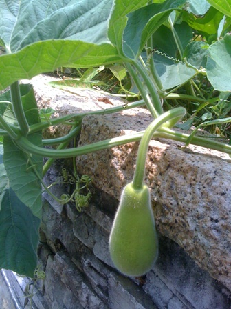 瓠瓜生長之快直可比擬吹氣球一般令人瞠目結舌,見花蒂下果實姆指般大,二天後大如手掌,一週後大到可以摘食! 其花開、結果過程更令人驚奇,如同夜間煙火,「轟」地一聲,花、果爆滿園,庭院繽紛絢爛,小瓢蟲、金龜子…等小昆蟲一同參與,熱鬧滾滾。我喜歡那強盛的生命力,眼見它茁壯、花開、蒂落、瓜熟…,循著自然的軌跡前行,成長的感動、收成的喜悦。