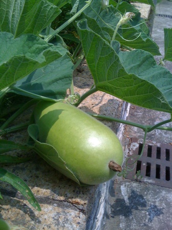 大片大片的綠葉也很賞心悦目,只是好奇朋友說的不知是真是假,當下將一枝枝藤蔓心摘去。果不其然,一週後陸續開花,二週後結小果,三週後… 哇! 大到可以摘食,東一個、西一個,大豐收! 當第一顆瓠瓜上餐桌時,全家興奮得立時將之一掃而光。自家有機瓠瓜鮮甜甘美,餐桌上必備菜色,姪女同學來,吃過也讚賞不已,可姪女一臉無奈地對同學說「每天吃,一連吃一星期,看妳還說不說它甜!」。呵~這可是自家園裏生長,無污染無農葯有機蔬菜,吃食不完,分送給鄰居、朋友,送得開心,收的人也高興。