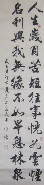 李傳續兄拿到一本字帖則仔細臨帖,每本字帖經常臨習多遍,故頗能抓住字帖的精神,用到自運的部分,其所寫行書,呂萬傑指導老師也覺得頗為流暢,予以稱讚。李兄曾經送我二幅佳作供我參考。一幅為其書寫我所作的七言律詩「冬之頌」(可點選),一幅為其書寫喜愛的嘉言對聯,都是行書,點畫間游絲映帶,細如毫髮,活潑自然,尤其是不如二字之間的游絲,欲斷還連,真是神來之筆。我妥為珍藏,興致來時,則取出欣賞,一樂也。我有時也會請其指教,他總能示範並告知可以改進之處。有次寫隸書時,我一直不解為何口部左內側會有一突出點,李兄告以只要用逆入平出之法即可見其效果,一試果然如此。其言之有物,大抵如此。