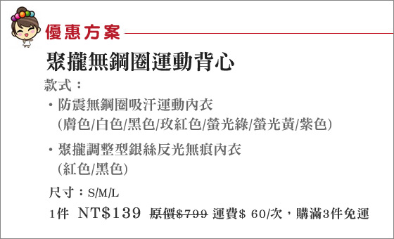商品訊息簡述: 只要139元(3件免運)即可購得原價799元聚攏無鋼圈運動背心1件,款式:防震無鋼圈吸汗運動內衣/聚攏調整型銀絲反光無痕內衣,尺寸:S/M/L,各有多色可選!