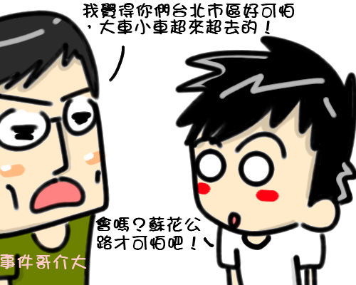 台北市的路況 比蘇花公路還恐怕 蘇花只要擔心落石 台北市可是要擔心大人..小人..不知名的人 不知會從哪裡竄出來