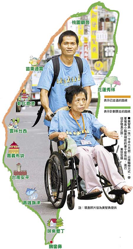 .... 因為妻子已走到生命的後半段,黃智勇(52歲)推著四肢癱瘓、罹患小腦萎縮症的妻子蔡秀明(51歲),從桃園一步一步走到台南安平南鯤,還打算從台南走回桃園,徒步二、三百公里,只為圓妻子的環島夢,他說:「因為愛她,再辛苦我都願意做。」 在北市環保局內湖焚化廠任工程師的黃智勇說:「20年前見秀明那一眼,我就決定娶她為妻,不管她變老、變醜。」他與蔡秀明結婚20年,妻子卻在11年前罹患小腦萎縮症,從走路不穩至四肢癱瘓,病情不斷惡化,但黃智勇對妻子不離不棄,今年6月妻子一句話「我想到處去看看」,黃智勇即於6月17日選定桃園觀音鄉開始環島。 黃智勇的環島計劃沒有告訴任何人,今年7月小腦萎縮症病友協會,因要通知他參加活動,才發現兩人的環島之旅……