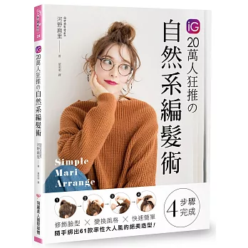 每款髮型皆有分解定格示範,只要4~8步博客來暢銷書驟、百分百完美複製書上髮型!你最想要的反三股辮、魚骨辮、反轉編髮……,只要跟著做就能輕鬆上手!另外貼心附錄保養頭髮的技巧及電綁捲使用方法,初學者最好實踐的編髮書,時尚造型和柔順髮質一次擁有!