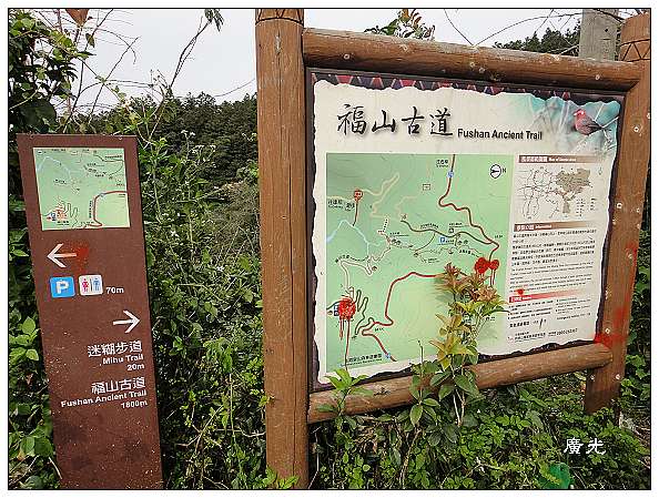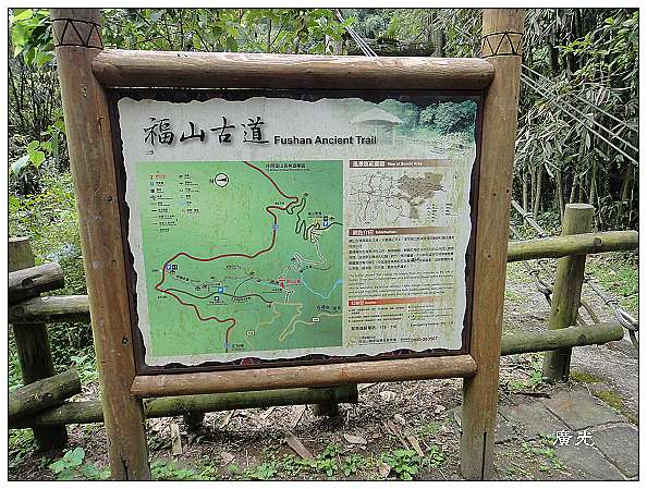 整建完成的福山古道入口位於福山部落內,有停車場、廁所、涼亭,整理得十分清爽,看得出交通部觀光局是頗費心的整建,建築頗有原住民風。