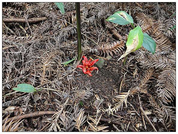 原來這就是「山奈」的果實,是我第一次在野地裡看到他。山奈,跟我們常吃的薑,及野薑花(穗花山奈)同樣都是屬於薑科的植物,只是同屬的野薑花在枝頭開的是白色的香花,而山奈的花朵卻是開在地面上,花色紫紅。