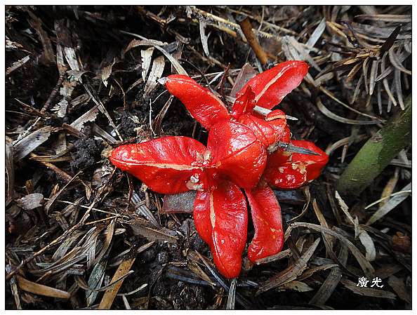 走著走著在林蔭下發現一團一團紅色的物體,是以往從未見過的,直覺的認為:「我發現寶貝了!」