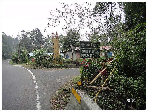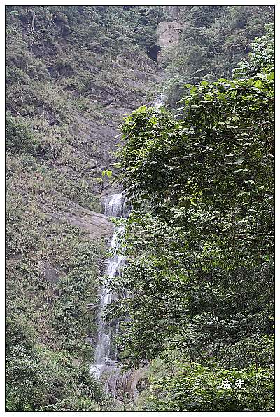 原來,身後陡峭的山壁之上高掛一匹白色的水簾,瀑布的頂端就是阿里山公路,所以這一座涼亭應該命名為「觀瀑亭」。只可惜距離遠了些,又被樹木遮去了一半所以看得不是很清楚,如果能修築一條小徑直通山崖下,應該又是一處不錯的景點。