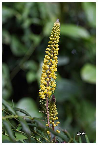 農民在茶園邊種了整排的「阿里山十大功勞」,開滿整串的黃花。