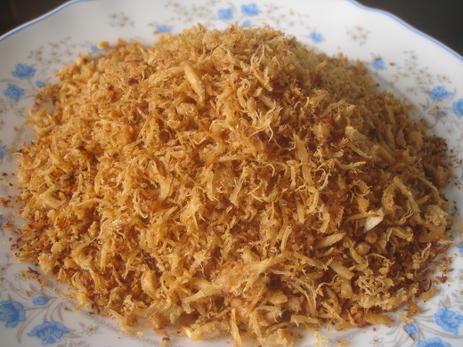今天炒的是雞肉鬆,用的是上星期熬雞湯所剩下來的雞胸肉,參考了格友的食譜,又習慣性的稍稍略減了鹽和油的量。成品看來還不錯,口感不若市售肉鬆那麼油酥,但拌飯吃,或包在飯糰裡,其實還蠻香的呢。