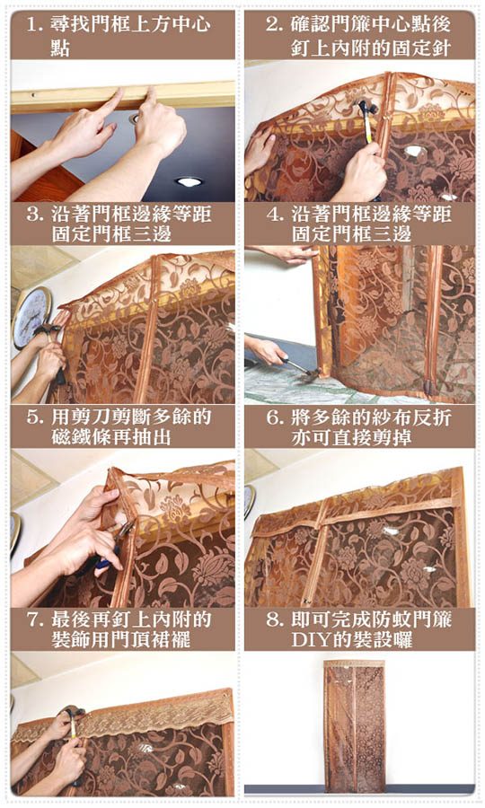 簡單輕鬆就能組裝在門上,不傷害門框,四段強磁扣開合,進出自動密合,連小孩、寵物都能自由進出不費力,趕快把家裡變成蚊蟲們無法闖關的禁地!