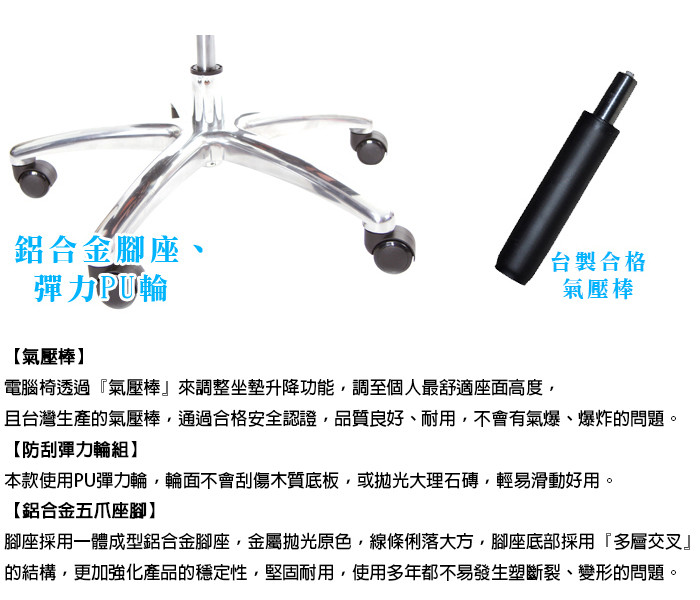 款式:無扶手、鋁合金腳座、PU輪