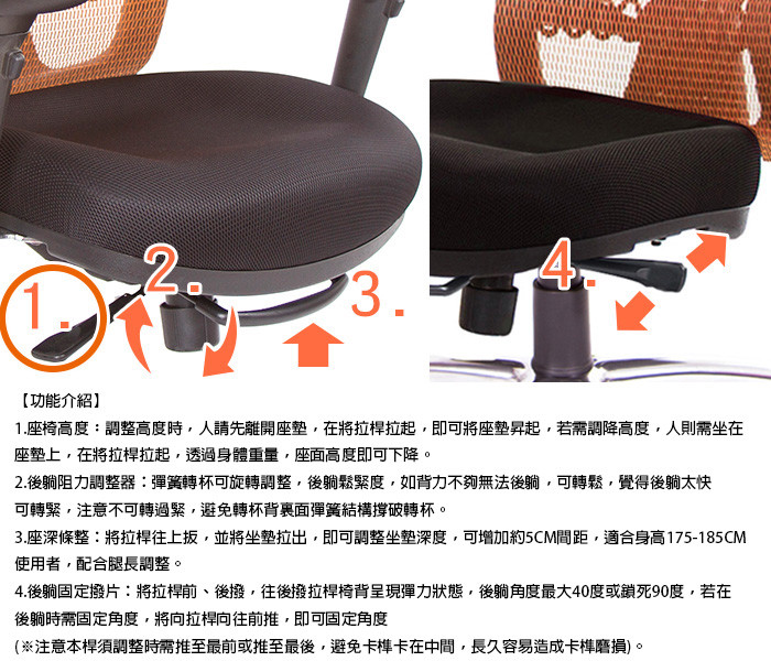 7.使用座椅前,需注意使否有安裝、鎖定穩固,請勿站在椅子上、跳座上椅子、蹬腳、雙腳離地、盤腿在座椅上,不當使用容易發生危險。