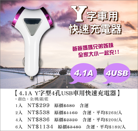 平均每入最低只要189元起(含運)即可購得4.1A Y字型4孔USB車用快速充電器1入/2入/4入/6入,顏色:金/桃/銀/藍。