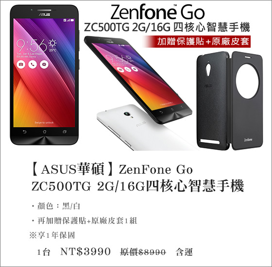 只要3990元(含運)即可購得【ASUS華碩】原價8990元ZenFone Go ZC500TG 2G/16G四核心智慧手機1台,再加贈保護貼+原廠皮套1組,顏色:黑/白,享1年保固。