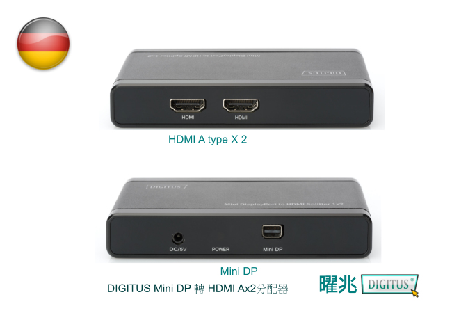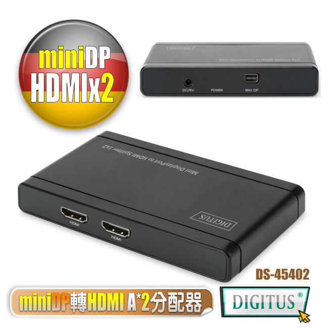 商品訊息描述: 曜兆DIGIUTS 4K2K miniDP轉HDMI AX2一入二出獨顯分配器