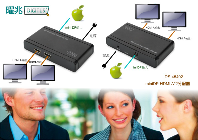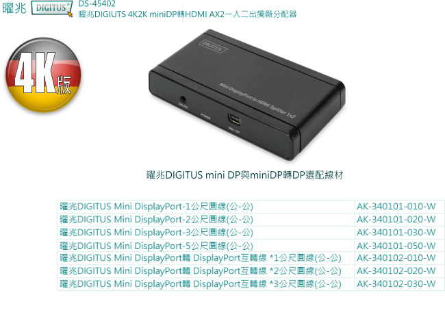 曜兆DIGIUTS 4K2K miniDP轉HDMI AX2一入二出獨顯分配器
