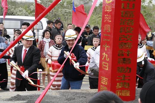 一行人隨後轉往動土會場,傅縣長向馬總統提議和與會眾人共同為去年以及所有在蘇花公路發生意外傷亡的死者默哀一分鐘,馬總統之後帶領眾人持鍬動土祈求工程順利,並走上堤防聽取公路總局吳局長作施工報告,深入了解橋樑工程及施工地點。