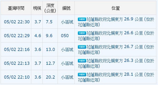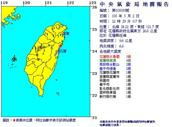 花蓮2日晚間10時29分發生芮氏規模4.6地震,深度9.6公里,震央位於花蓮縣政府北偏東方26.6公里,即為花蓮縣近海。中央氣象局最新資料顯示,各地最大震度,花蓮縣太魯閣5級、宜蘭縣南澳4級、南投縣合歡山2級、台中市德基2級。這是花蓮今晚發生的第5起地震。
