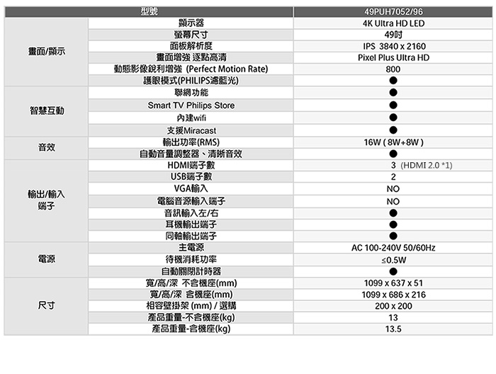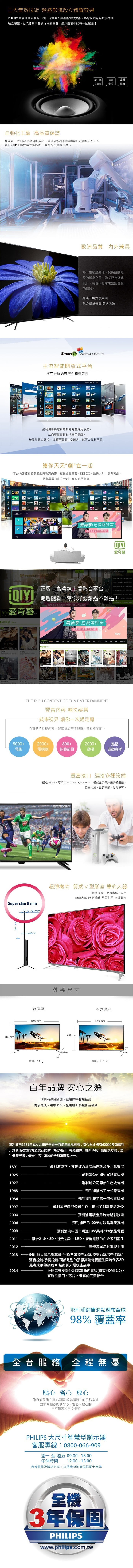 - ■4K UHD 超高畫質體驗? ■IPS廣視角/不閃屏技術? ■智慧聯網功能? ■Smart TV Philips Store? ■支援Miracast無線傳屏? ■多功能接口全面多媒體播放? ■三年原廠保固服務
