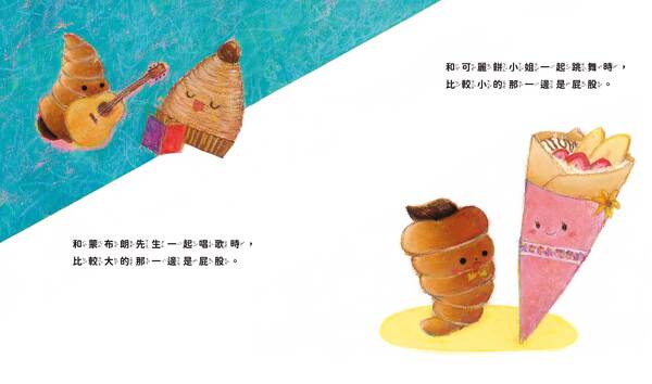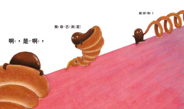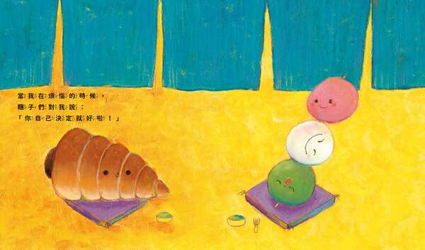 如果說吃麵包能得到飽足,繪本則給予了心靈的富足,整本書的基調就如同螺旋麵包甜甜的巧克力內餡,柔軟之中,螺旋麵包的自我探索之路更為讀者帶來勇氣,像要與老家的麵包店呼應似的,祐彩也用自己的方式烤出了他獨特的螺旋麵包!