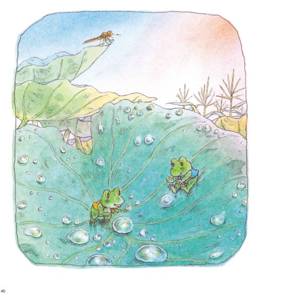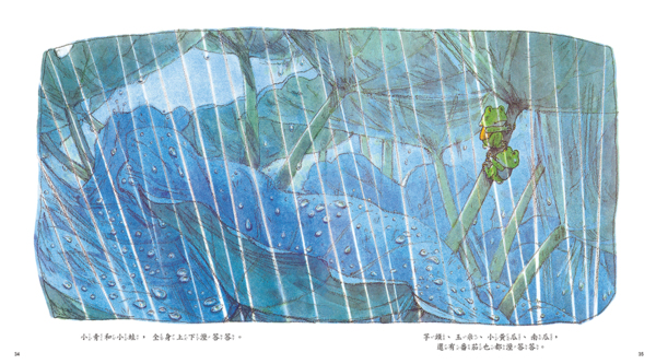 不管跳到哪裡,小青和小蛙都覺得不夠涼快,好熱、好熱啊!就在這個時候來烏雲飄了過來,又閃電又打雷的,嘩啦啦啦下了很大的一場雨,把小青、小蛙和菜園都淋得溼答答的。經過雷陣雨洗刷大地後,一陣風吹來,哇,想像起來就好涼快呀!一直懶洋洋,彷彿被曬昏頭了的小蛙,像是被大雨拯救了,也終於醒過來,精神抖擻的和小青一起玩起了滾露珠。看到這裡,不難理解熟悉自然生態的作者岩村和朗為何會選擇以青蛙為主角。每到下雨天,青蛙總是叫得特别響,因為他們不喜歡炎熱或太乾燥的地方,喜歡陰涼潮濕的環境,所以下雨的時候,青蛙們是最高興不過了~