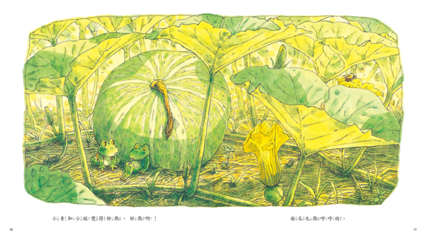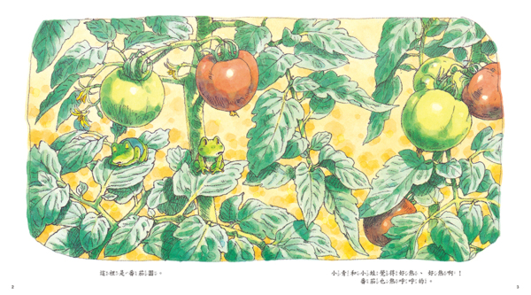 翻開繪本《小青和小蛙:好熱、好熱啊!》,從陽光充足的番茄田開始,小青和小蛙被曬得頭昏腦脹的樣子,小青一馬當先開始尋找更涼爽的地方,日本繪本大師岩村和朗以他拿手的鉛筆加上透明水彩,把各種菜園景致描繪得生機盎然,讀者可以跟著小青和小蛙「蹦、蹦,噗咻──」跳到不同的菜園裡,發現不同蔬菜的生長面貌。除了番茄,還有南瓜田、小黃瓜田、玉米田、芋頭田,每一種蔬菜都有獨特的果實和枝葉結構,仔細觀察,還可以發現穿梭其中的蜜蜂、蝴蝶、螳螂……等等。