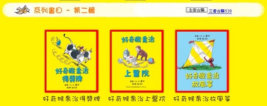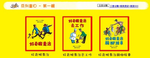 這是關於 George 這隻黃色小猴子(中譯《好奇猴喬治》,青林國際出版)的淘氣冒險故事第一本出版至今已有六十多年,還是歷久不衰,可見其魅力所在。書中的插圖畫風簡易但深具幽默感,不只孩子喜歡,大人也同樣深深著迷。除了以下列出的作品,該系列還有其他書目請自行參考,這系列的文字內容雖已開始跳脫小孩適讀的簡單句型,但程度不難。如果孩子已是小學中、高年級,具有基本英文聽力,想要激發他們聽英文故事的興趣,可以從這個系列開始嘗試,多數作品都附有錄音帶可反覆聽取。