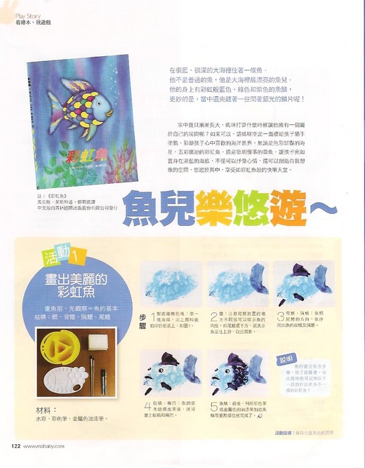 擁有閃亮鱗片的彩虹魚,是海底世界最美麗的一條魚,讓其他許多的魚都羨慕不已,你是不是也希望能擁有一條彩虹魚呢?本期(2010年10月號,第245期)育兒生活雜誌「Play Story 看繪本玩遊戲」單元(P.122),特別邀請到蘇荷兒童美術館的美術老師,,從觀察魚鰭、眼睛、嘴巴線條開始,一步步帶領孩子如何彩繪彩虹魚,想創作出專屬於你的彩虹魚嗎?喜歡彩虹魚的你(妳),千萬不可錯過喔!