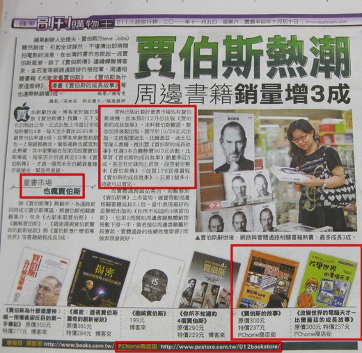 蘋果創辦人史提夫.賈伯斯(Steve Jobs)驟然辭世,引起全球譁然,不僅傳出即將開拍電影的消息,在台灣的書市也掀起一波賈伯斯風潮,除了《賈伯斯傳》連續蟬聯博客來、金石堂等網路通路排行榜冠軍,周邊相關書籍《大家來看賈伯斯》、《賈伯斯為什麼這麼神》、漫畫《賈伯斯的成長故事》等也連帶熱銷增3成。