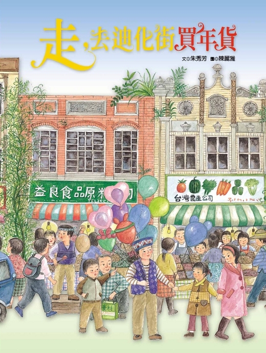 「走,去迪化街買年貨」是由兒童文學名家朱秀芳、知名繪本插畫家陳麗雅聯手創作,為了完成這本繪本,可以說是上上下下、左左右右、前前後後把迪化街給訪遍了,而且訪談了不少街上商戶和住民。因此,故事不僅帶出迪化街的各種特色,插畫也把商家的各種細節給畫上了,書末也特別針對插圖細節註解說明,讓爸爸媽媽和老師可以按圖索驥,帶著孩子閱讀和觀察。