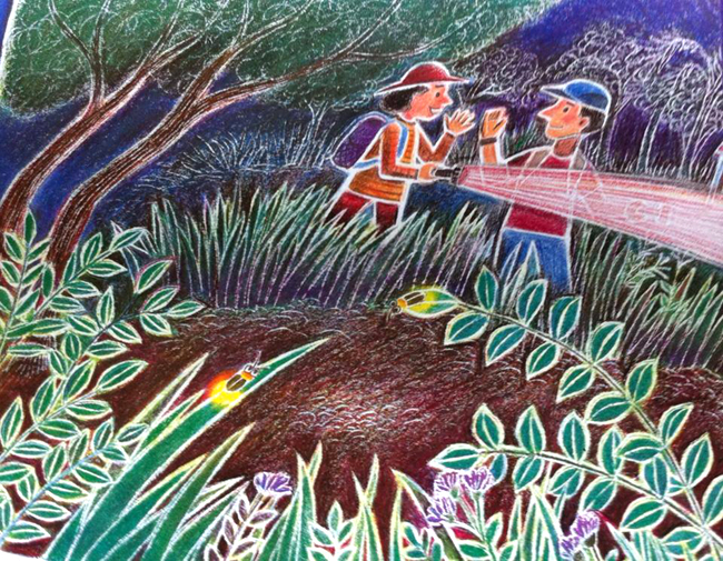 無數的螢火蟲飛舞在水池畔、在水溝旁、在山坡地帶、在不同層次的坡地草叢裏,在油桐和相思林梢;在向下的山谷,在往上各階梯、欄杆;在石頭以及水泥步道上;