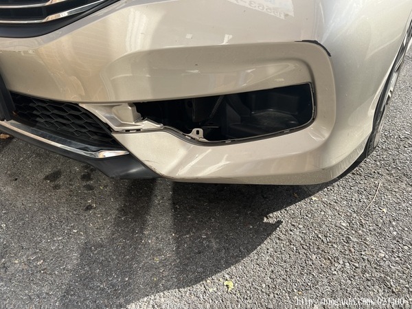 我一到修車廠,就發現駕駛座前面保險桿的一塊板子被撞飛了,只見一個大洞,看起來蠻嚴重。林先生立刻安慰我說,這是小事,重裝一塊板子就好。林先生檢查之後,除了板子被撞飛和漆被刮掉之外,幸好其他沒有什麼損傷。林太太立刻打電話查詢為我訂零件,訂好之後林先生跑到經銷商那裡去拿,回來為我裝上,前後不到一個小時就處理好。我以為會要好幾百,沒有想到林太太只收了我零件的錢。