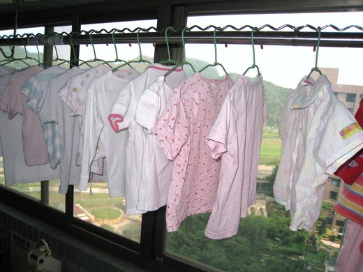 小朋友的衣服都是我去朋友家載回來的,裝成一包、一包時,看了沒有什麼感覺。等到思霈分批拿出來清洗,一件、一件掛在曬衣架上,讓人看了感覺彷彿她已在這屋裡跟我們共同生活,那是一種說不出的甜蜜心情。