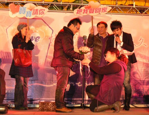 3月14日白色情人節的前夕,在平溪菁桐國小的操場,和千百名民眾一起看著司令台上一名女子手握捧花、單腳下跪,向她的男朋友求婚。