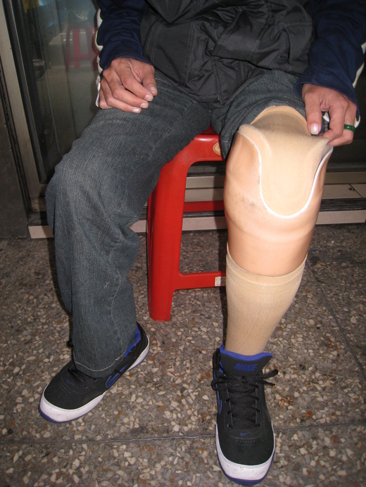 他說,阿和去年常因左腳義肢不合腳,到街頭打工,為建商舉牌一段時間,左膝就會紅腫發炎必須就醫,不得不把在街頭承受風吹、日曬、雨淋賺來的辛苦錢送給醫師,為此懊惱不已。