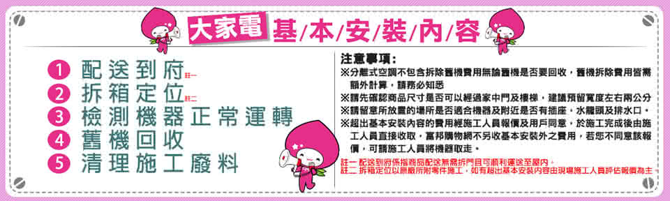 1.購買時請確認坪數商品大小與裝機尺寸,到府安裝若坪數尺寸大小不符導致無法搬運安裝,必須支付師傅500元空趟費。