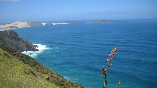 北島尖端的Cape Reinga(瑞恩加岬角)塔斯曼海太平洋左右中分, 跟鵝鑾鼻為巴士海峽和太平洋的交界處一般, 顏色有著明顯的差異. 這兒更覺藍得耀眼藍得令人心醉..海面朵朵白色浪花綻放, 那樣純淨的藍與白, 世間任何彩筆言語都無法形容! 群山環繞一灣綠水白沙的Te Hapua(提哈普阿), 位於90哩海灘路及Cape Reinga中間, 是個理想的衝浪露營或午餐停留點. Hourara Head(荷拉拉角)也是值得停駐的地點, 山青水秀優美寧靜, 海水清澈透明, 而且退潮時兩三下就可摸到一袋好吃的Pipi蚌殼加菜! 想起很喜歡的郭強生寫的詩句: