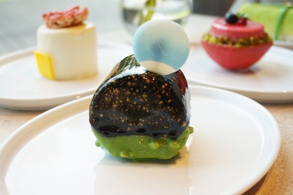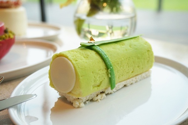 外型頗像竹葉的「青梅竹馬」,慕斯蛋糕吃起來有股淡雅酒香,因為主廚特別加入竹葉青製成,無論是外型或口感都令人想起童年常見大片竹林的情景,另一款外型像是水波紋的「晴耕雨讀」,主廚以晴天耕耘、雨天讀書作為發想,入口也是溢著微微酒香,底層為口感細緻的桂花地瓜蛋糕,是款充滿意境又美味的甜點,除此之外,還有「逃之夭夭」、「打不著」、「留螢」、「親荷」,都是主廚發揮創意與聯想力所創作出來的甜點。
