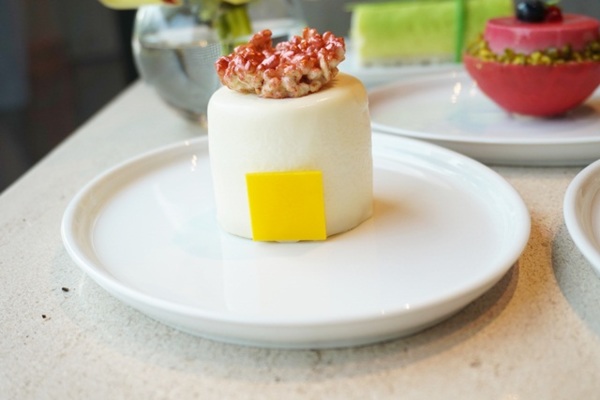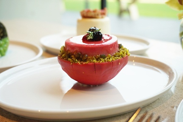 本次「兒時夏趣」創作,主廚將背景拉回40~70年代的農業生活,創作出7款嶄新融入早年童趣的甜點,食材更特別選用像甘草芭樂、脆梅、蓮子及紅肉李等昔日垂手可得的夏日消暑聖品,在咀嚼甜點的同時,腦海也能跳出那種畫面。這次甜點有「陀螺」,甜點外型以傳統童玩為發想,內餡則選用紅肉李與石榴揉,酸甜滋味、獨特清爽。