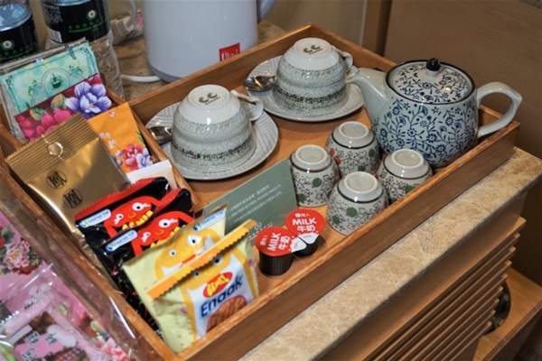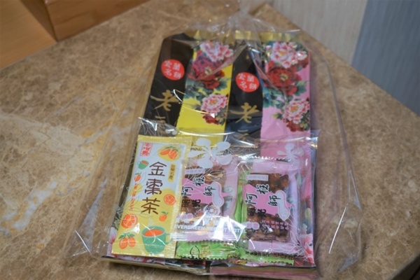 由於本次是參加了「老派潮日子」住房專案,所以桌上擺放了一包伴手禮,這包辦手裡裡面有宜蘭名產牛舌餅及金棗茶等,覺得飯店非常貼心,連這一點都想到了。