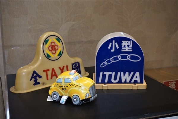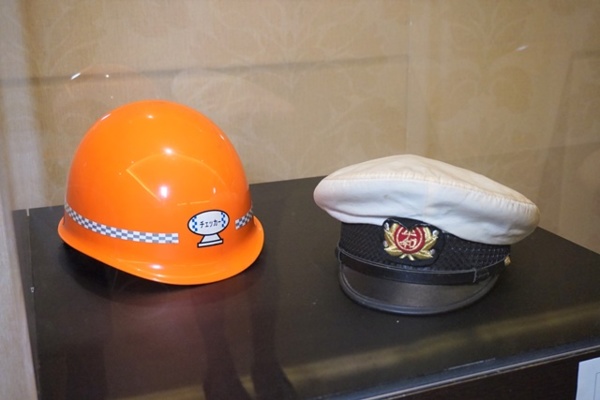 為了讓旅人能清楚了解擺放在五個透明玻璃櫃裡,第二櫃子裡陳列的珍貴物件為兩頂在昭和時期日本計程車司機所使用的帽子,橘紅色款為塑膠製白色寬版帽,大家會比較有印象,只不過現在計程車司機早已不戴帽子。