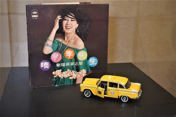 第四櫃子擺放的是昔日搖滾歌手歐陽菲菲於1977年錄製的《嘿嘿!計程車》黑膠唱片,相信五六年級生或許對這首歌節奏輕快的歌曲還有點印象。在前方則是一輛產於1963年的計程車模型。