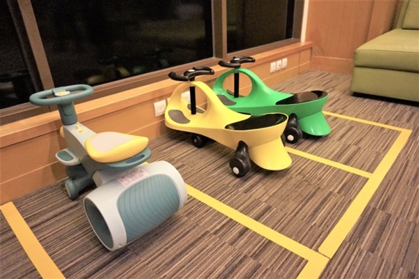 來飯店度假除了動腦筋,身體也要活動活動!飯店特別規劃了遊戲空間「扭扭台9線」,之所以會命名為台9線是因為在在雪山隧道未開通前,北宜公路是許多人自台北前往宜蘭選擇的路線,所以老派潮日子打造彎道賽事,邀請旅客駕著復古扭扭車尬車,是一款充滿充滿趣味與樂趣的活動。