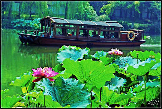 看完畫展,在西湖邊轉一轉,荷花開的很好。坐在湖邊賞花,再來一碗藕羹﹝藕粉泡的﹞,湖上蕩來清風,倦倦的又有點舒暢想入睡的感覺。隔天去湖濱吃了「九百碗麵」的老鴨麵,才八塊錢,很鮮甜的湯頭一口氣都喝光,雖然有點鹹。吃完麵去湖邊看夕陽西沉,不同變換的光影在湖上閃爍,雖然好像有一點孤獨,味道還是好的。