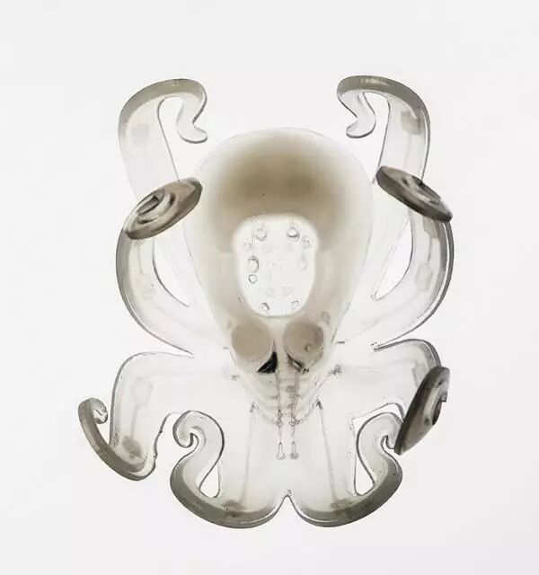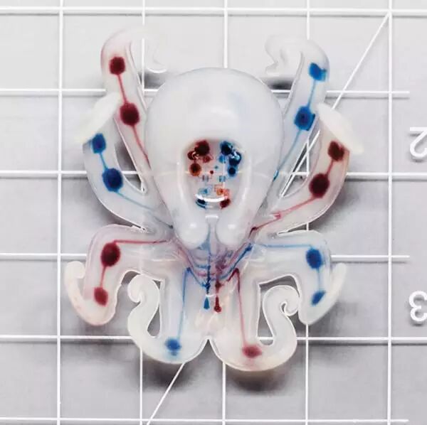 顏色顯示氣體可以通過不同的通道穿過機器人身體,交替移動一半的觸手,讓它擺動起來。這個機器人大約兩英寸長,約合5釐米