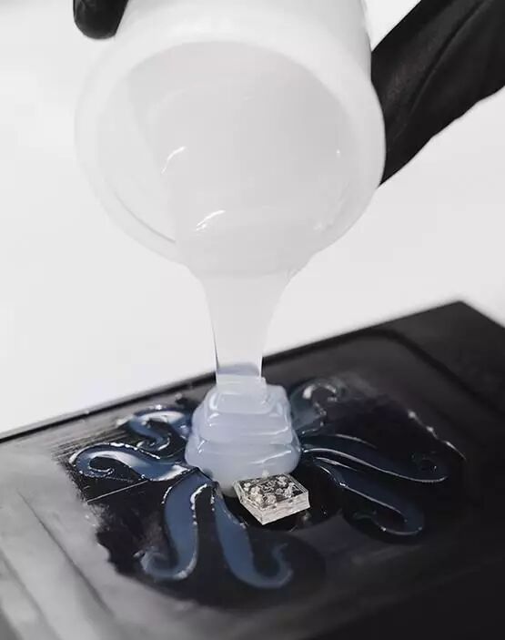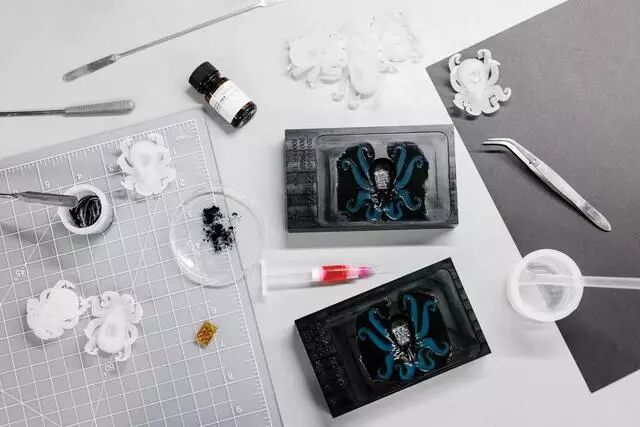 Octobot最主要的部件是軟微流控晶片,它是機器人的“大腦”,要指揮八個觸手的運動。 組裝的第一步驟是將矽樹脂混合物澆注到模具中。